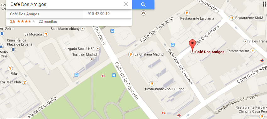 Café Dos Amigos - Tel: 91 542 90 19 - C/ Dos Amigos MADRID 28015 CRISOL DOS AMIGOS S.L. - CIF B83476713 - CALLE DOS AMIGOS 7 LOCAL - MADRID 28015 - TEL. 91 542 90 19. contacto@cafe2amigos.com |