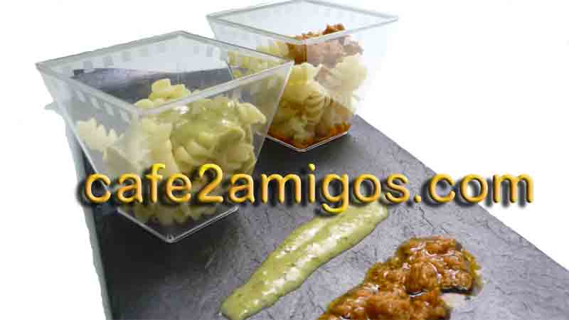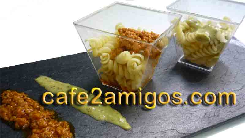 Comenzamos preparando la salsa pesto. Trituramos en un bol los tomates secos, la albahaca, unas gotas de zumo de limón, el ajo, los piñones, la guindilla, una pizca de azúcar, sal y un chorrito de aceite de oliva virgen extra.